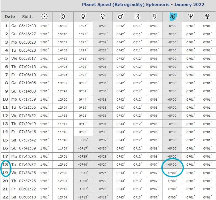 Comme le montre le tableau des vitesses planétaires sur janvier 2022, uranus transitant redevient direct entre les 18/19 janvier 2022 tout en étant carré au mars natal, maître de la maison mortifère 8: